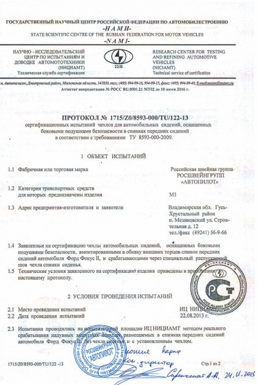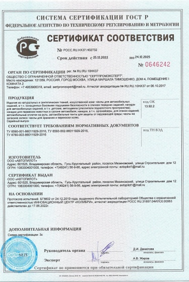 Российская швейная группа "АВТОПИЛОТ" имеет Сертификат и гарантирует соответствие чехлов требованиям нормативной документации, действующим правилам и стандартам (ГОСТ Р, ГОСТ Р ИСО). Наличие сертификатов в очередной раз подтверждает качество автомобильных чехлов, выпускаемых Росшвейнгрупп "АВТОПИЛОТ" и помогает автолюбителям сделать обоснованный правильный выбор при покупке авточехлов.