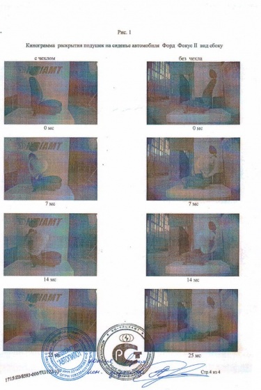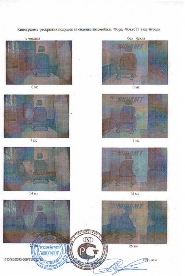Конструкция чехлов продумана таким образом, что бы, не нарушать заводскую функциональность салона. В подтверждении этого наша компания провела испытания по срабатывания подушки безопасности на переднем кресле автомобиля, на котором был установлен чехол. Испытания проводил Центральный Институт Экспертизы, Стандартизации и Сертификации, испытания прошли успешно, что подтверждается сертификатом качества № CS5.002.154C от 20.09.2010. Вывод экспертной комиссии: Чехол автомобильный производства компании ООО Росшвейнгрупп "АВТОПИЛОТ". Конструкция не препятствует срабатыванию подушки безопасности. Вы можете посмотреть видео и кинограмму.